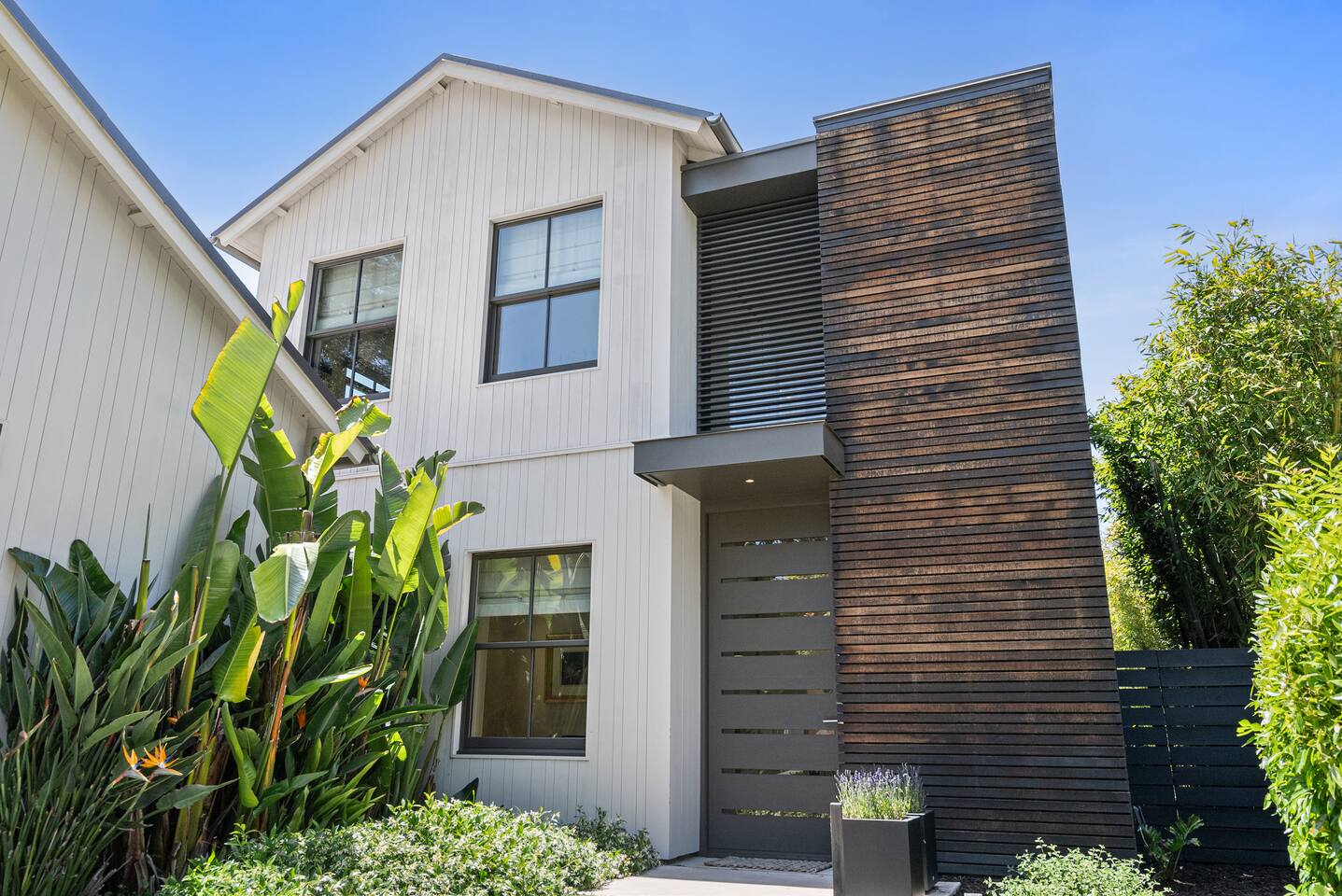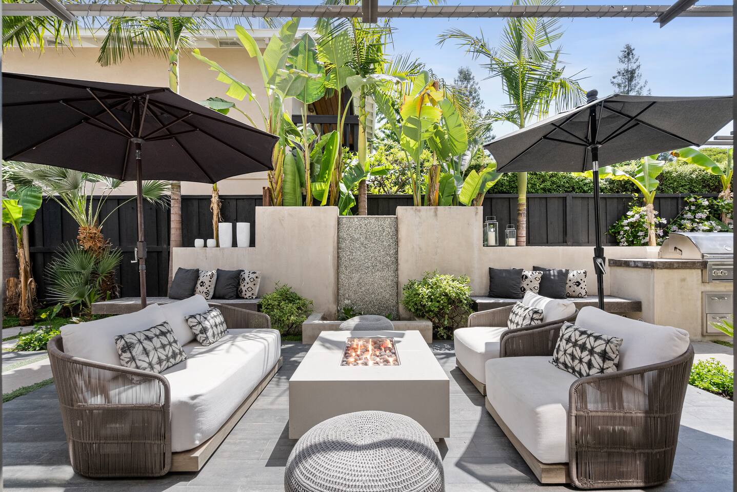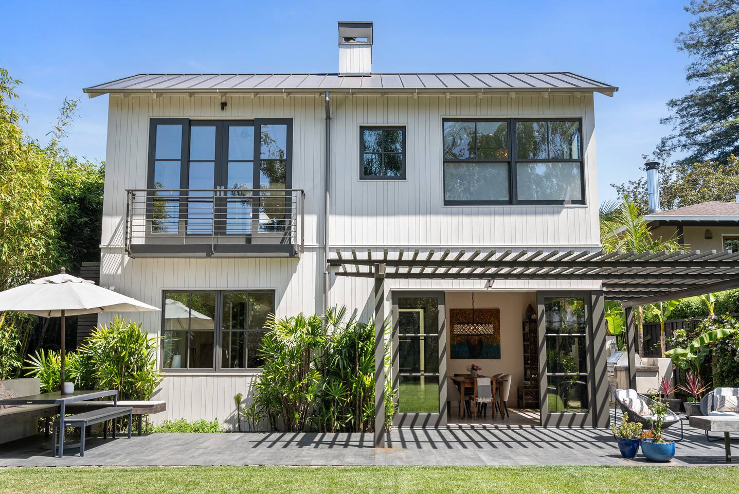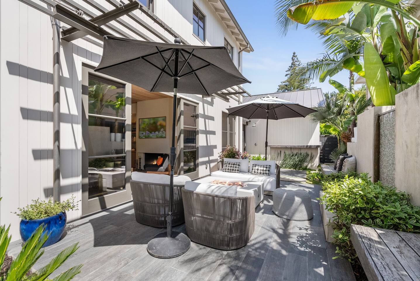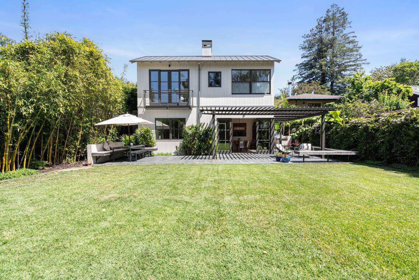 From the moment you step into this 3-bedroom, 3-bathroom, 2545-square-foot marvel, you'll be captivated by the soaring ceilings, abundant natural light, and the seamless blend of indoor-outdoor living. Expansive sliding doors connect the indoors to the private rear and side yards, creating a breezy, open sanctuary. Relax in the spacious living room, boasting a Samsung Art-TV and the convenience of a Sonos sound system throughout the home for your music enjoyment. The adjacent office, outfitted with dual desks, provides a serene workspace bathed in natural light. The culinary heart of the home is the large, fully-equipped kitchen, complete with a central island, bar area, sub-zero refrigerator, and a gas cooktop. A generously-sized pantry includes a wine fridge and ensures you have all the storage you need for your extended stay. Enjoy intimate meals in the dining area that opens beautifully to the outdoors, further enhancing the atrium-style design of the residence. Retreat upstairs to the three artfully designed bedrooms. The front bedroom has a cozy queen bed and built-in closets. The middle bedroom has a queen bunk below, a twinXL bed above, and a TV and desk area. Our primary bedroom is a haven of tranquility, featuring a king bed, high ceilings, and breathtaking views of the rear yard. Indulge in the luxury of our spa-like bathrooms. The primary bathroom offers a large oversized soaker tub, dual sinks, and a rain shower, while the upstairs hall bathroom features a spacious rain-style shower area. There's also a full-sized laundry room for your convenience. Step outside to your private retreat, featuring multiple seating areas in the rear yard, perfect for lounging. The large side yard offers a gas barbecue, a relaxing fountain, a hot tub, and an outdoor shower area - the perfect setting for relaxation under the California sky. Enjoy high-speed fiber optic Wi-Fi and plenty of parking spots in the driveway. The home's location offers easy access to Stanford University, Stanford Shopping Center, Stanford Hospital, Lucille Packard Children's Hospital, Downtown Palo Alto and Menlo Park, and the Allied Arts Guild. Radiant heating, mini split cooling in bedrooms and upstairs, and a sophisticated yet inviting design make the home a year-round sanctuary. This is not just a stay; it's an experience of living in architectural excellence. Welcome to an oasis of calm in the heart of Silicon Valley.