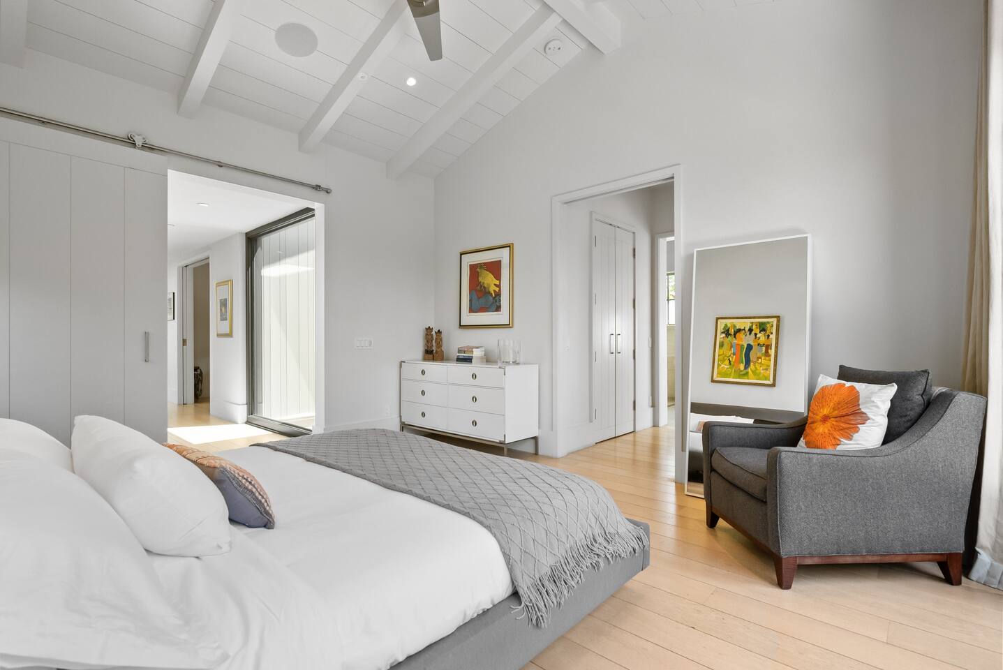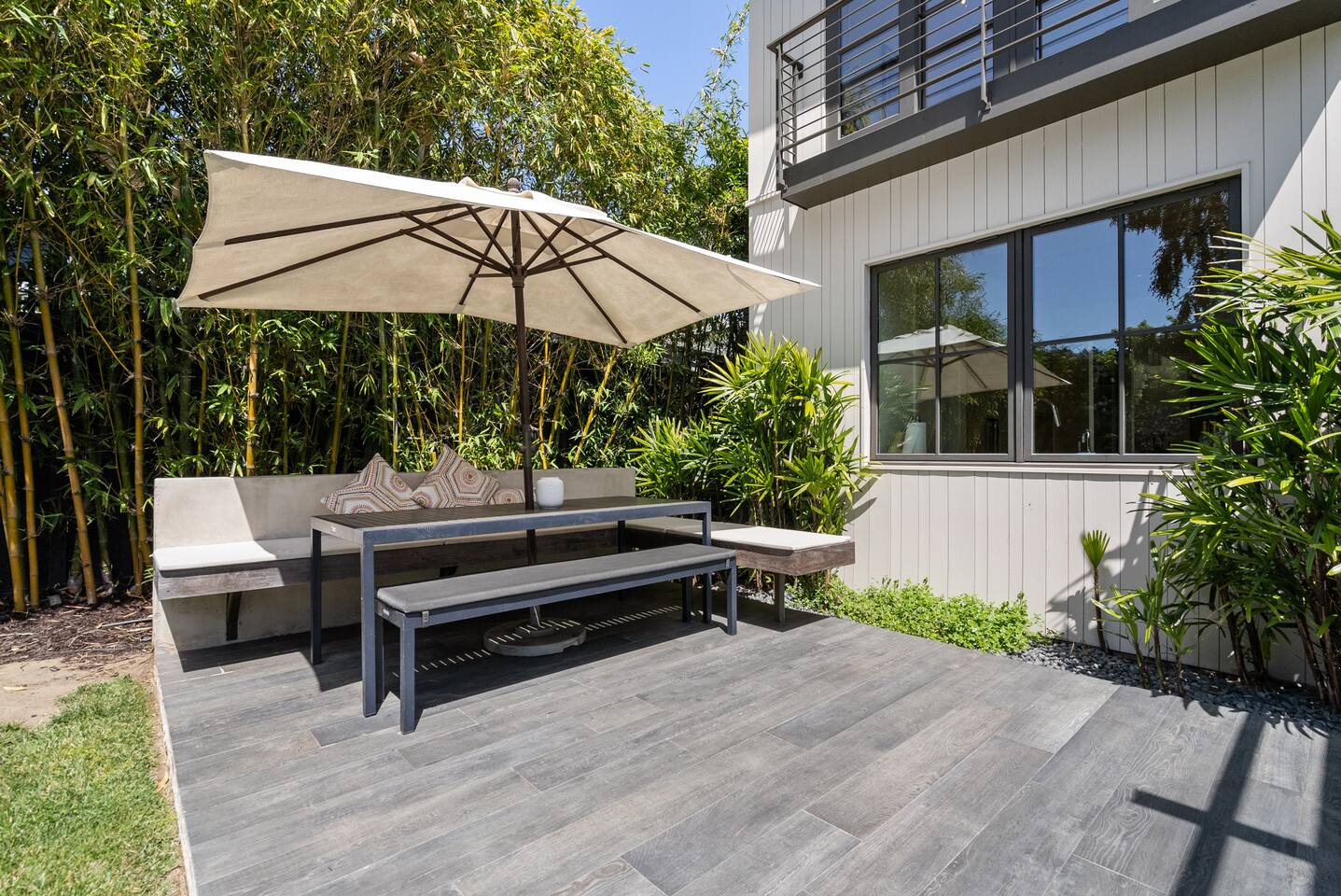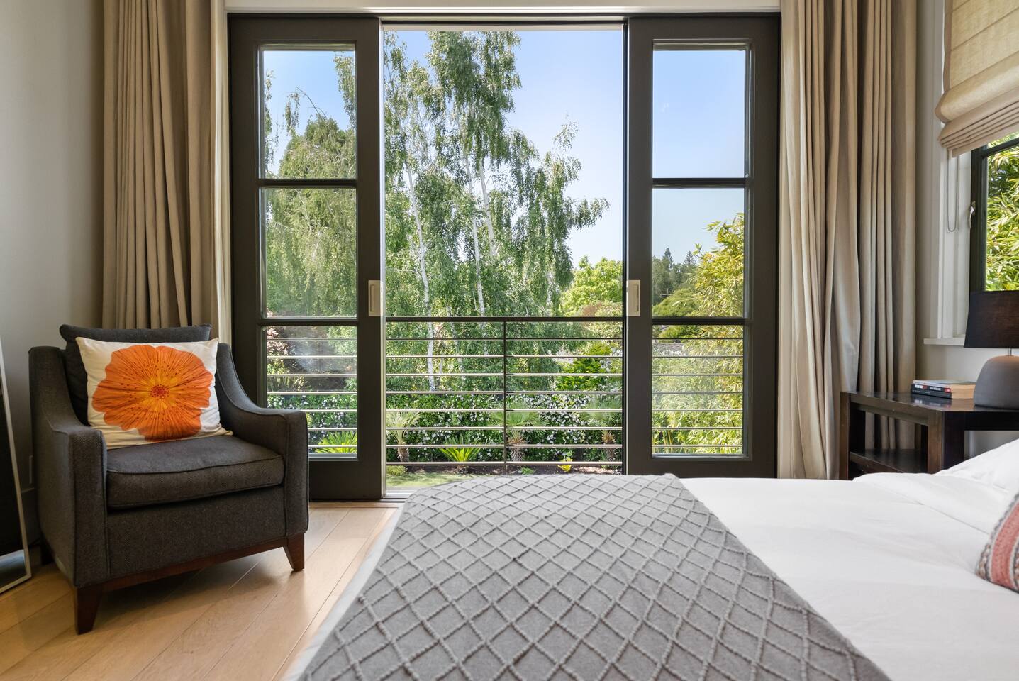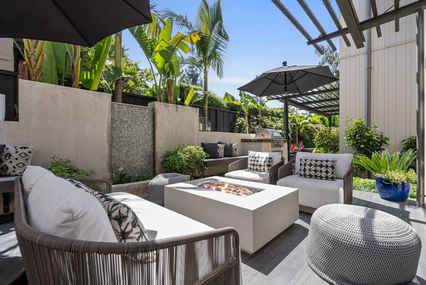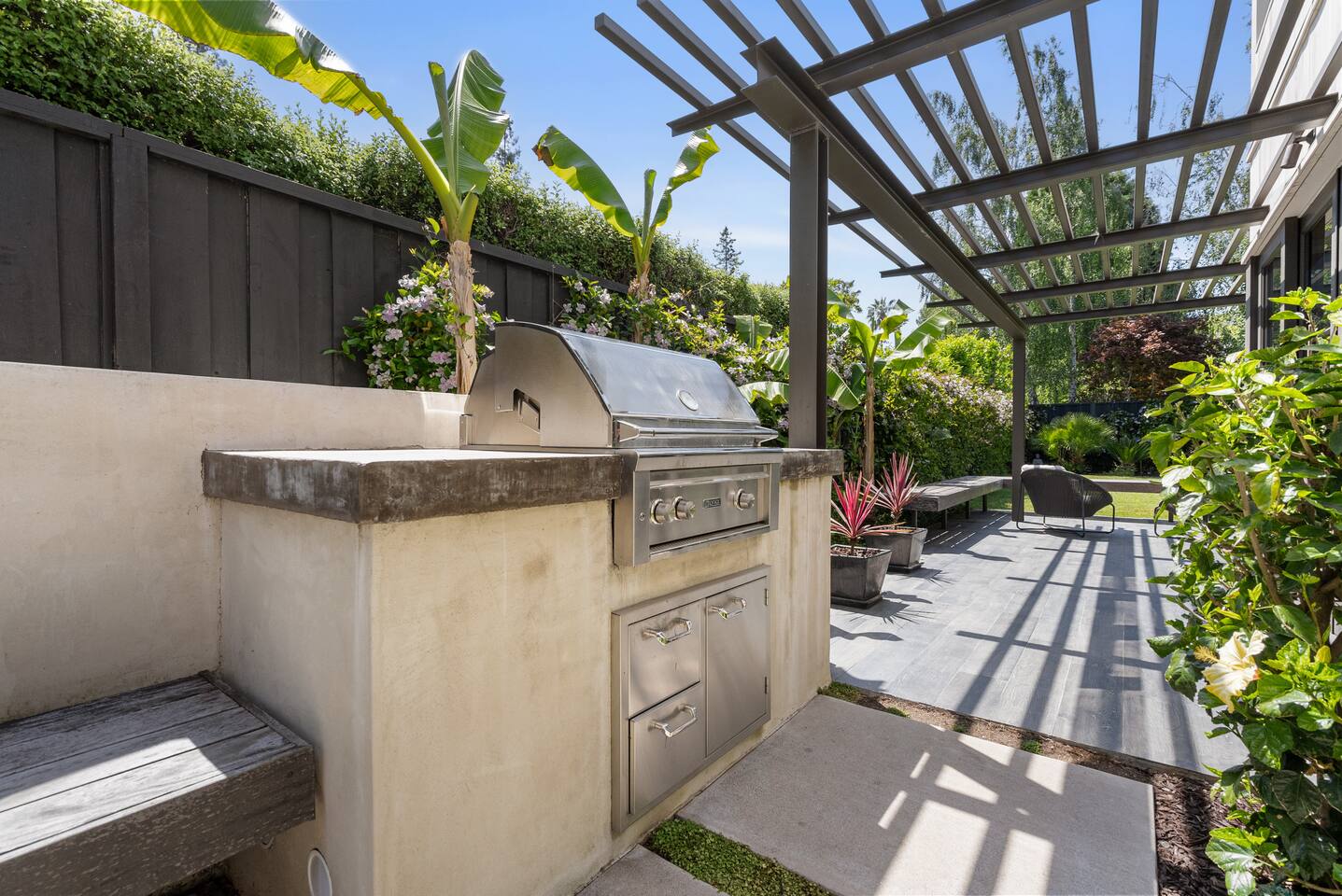 From the moment you step into this 3-bedroom, 3-bathroom, 2545-square-foot marvel, you'll be captivated by the soaring ceilings, abundant natural light, and the seamless blend of indoor-outdoor living. Expansive sliding doors connect the indoors to the private rear and side yards, creating a breezy, open sanctuary. Relax in the spacious living room, boasting a Samsung Art-TV and the convenience of a Sonos sound system throughout the home for your music enjoyment. The adjacent office, outfitted with dual desks, provides a serene workspace bathed in natural light. The culinary heart of the home is the large, fully-equipped kitchen, complete with a central island, bar area, sub-zero refrigerator, and a gas cooktop. A generously-sized pantry includes a wine fridge and ensures you have all the storage you need for your extended stay. Enjoy intimate meals in the dining area that opens beautifully to the outdoors, further enhancing the atrium-style design of the residence. Retreat upstairs to the three artfully designed bedrooms. The front bedroom has a cozy queen bed and built-in closets. The middle bedroom has a queen bunk below, a twinXL bed above, and a TV and desk area. Our primary bedroom is a haven of tranquility, featuring a king bed, high ceilings, and breathtaking views of the rear yard. Indulge in the luxury of our spa-like bathrooms. The primary bathroom offers a large oversized soaker tub, dual sinks, and a rain shower, while the upstairs hall bathroom features a spacious rain-style shower area. There's also a full-sized laundry room for your convenience. Step outside to your private retreat, featuring multiple seating areas in the rear yard, perfect for lounging. The large side yard offers a gas barbecue, a relaxing fountain, a hot tub, and an outdoor shower area - the perfect setting for relaxation under the California sky. Enjoy high-speed fiber optic Wi-Fi and plenty of parking spots in the driveway. The home's location offers easy access to Stanford University, Stanford Shopping Center, Stanford Hospital, Lucille Packard Children's Hospital, Downtown Palo Alto and Menlo Park, and the Allied Arts Guild. Radiant heating, mini split cooling in bedrooms and upstairs, and a sophisticated yet inviting design make the home a year-round sanctuary. This is not just a stay; it's an experience of living in architectural excellence. Welcome to an oasis of calm in the heart of Silicon Valley.