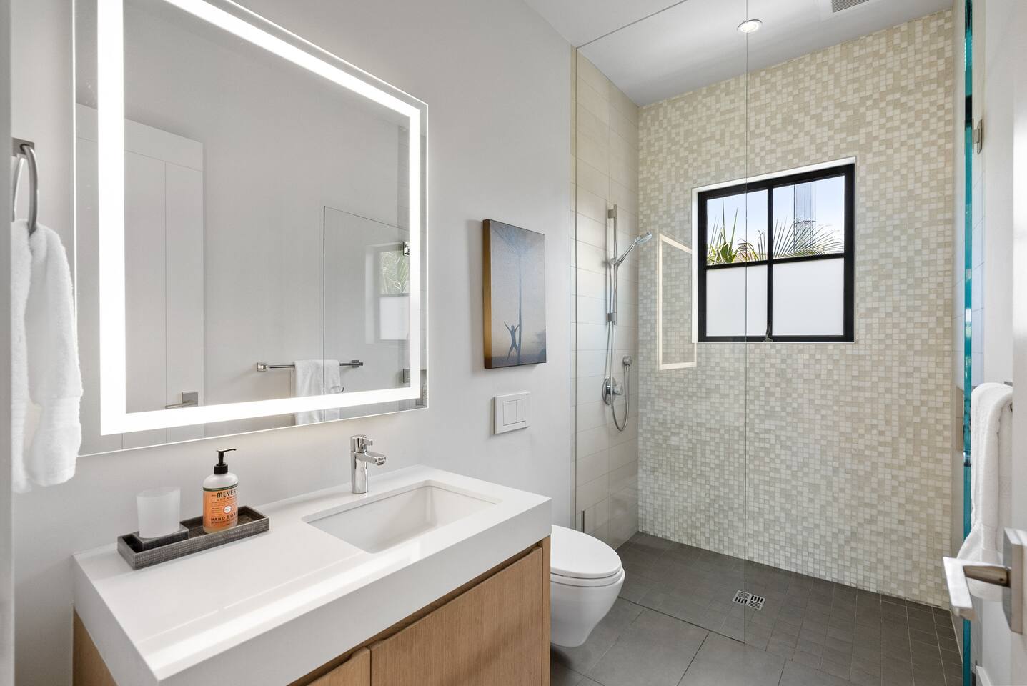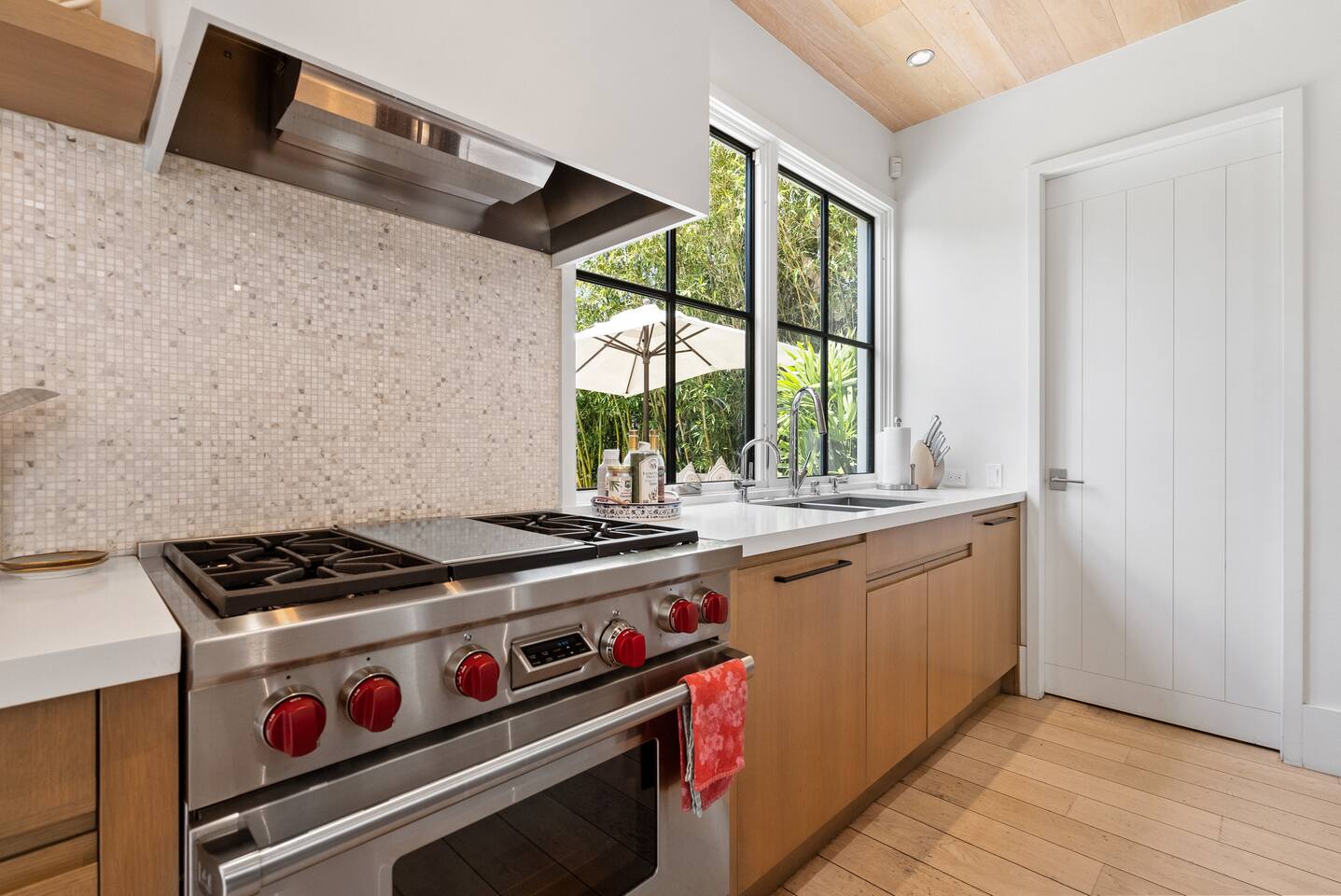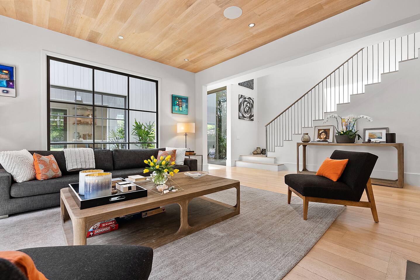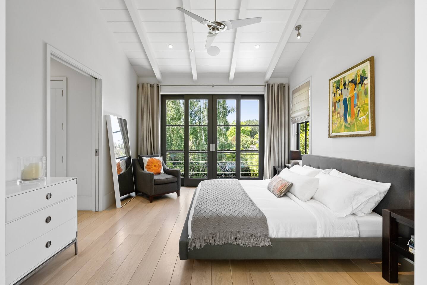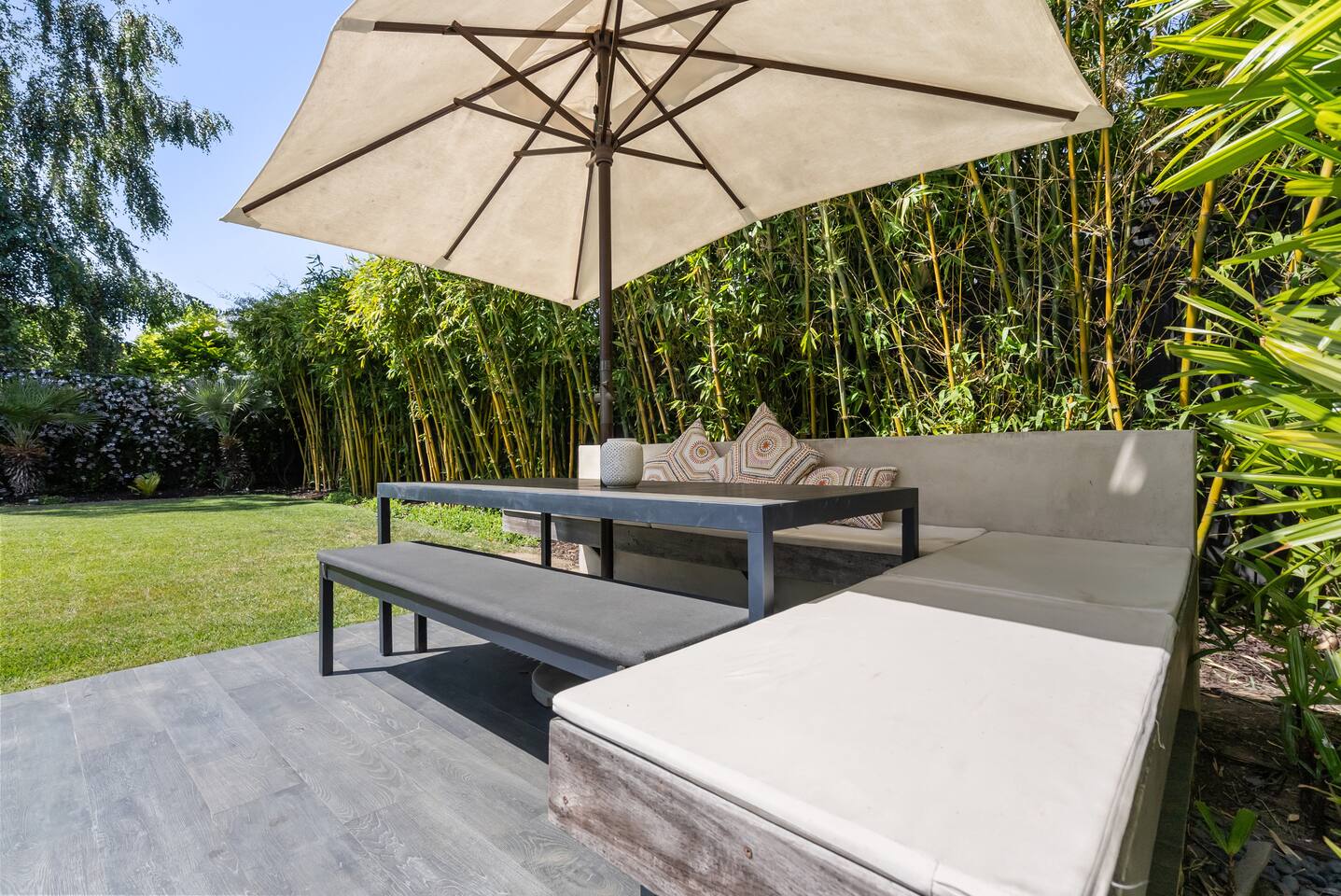 From the moment you step into this 3-bedroom, 3-bathroom, 2545-square-foot marvel, you'll be captivated by the soaring ceilings, abundant natural light, and the seamless blend of indoor-outdoor living. Expansive sliding doors connect the indoors to the private rear and side yards, creating a breezy, open sanctuary. Relax in the spacious living room, boasting a Samsung Art-TV and the convenience of a Sonos sound system throughout the home for your music enjoyment. The adjacent office, outfitted with dual desks, provides a serene workspace bathed in natural light. The culinary heart of the home is the large, fully-equipped kitchen, complete with a central island, bar area, sub-zero refrigerator, and a gas cooktop. A generously-sized pantry includes a wine fridge and ensures you have all the storage you need for your extended stay. Enjoy intimate meals in the dining area that opens beautifully to the outdoors, further enhancing the atrium-style design of the residence. Retreat upstairs to the three artfully designed bedrooms. The front bedroom has a cozy queen bed and built-in closets. The middle bedroom has a queen bunk below, a twinXL bed above, and a TV and desk area. Our primary bedroom is a haven of tranquility, featuring a king bed, high ceilings, and breathtaking views of the rear yard. Indulge in the luxury of our spa-like bathrooms. The primary bathroom offers a large oversized soaker tub, dual sinks, and a rain shower, while the upstairs hall bathroom features a spacious rain-style shower area. There's also a full-sized laundry room for your convenience. Step outside to your private retreat, featuring multiple seating areas in the rear yard, perfect for lounging. The large side yard offers a gas barbecue, a relaxing fountain, a hot tub, and an outdoor shower area - the perfect setting for relaxation under the California sky. Enjoy high-speed fiber optic Wi-Fi and plenty of parking spots in the driveway. The home's location offers easy access to Stanford University, Stanford Shopping Center, Stanford Hospital, Lucille Packard Children's Hospital, Downtown Palo Alto and Menlo Park, and the Allied Arts Guild. Radiant heating, mini split cooling in bedrooms and upstairs, and a sophisticated yet inviting design make the home a year-round sanctuary. This is not just a stay; it's an experience of living in architectural excellence. Welcome to an oasis of calm in the heart of Silicon Valley.
